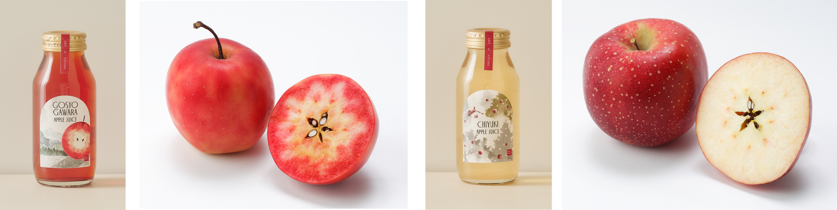 〇千雪(ちゆき): りんごにはめずらしい、果肉の褐変がほとんどない品種です。酸味がおだやかで、上品な甘さが特徴の、真っ白なジュースに仕上がりました。